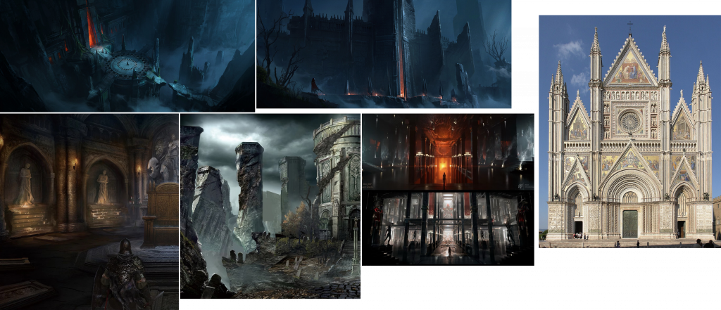 I collected the conceptual design of ArtStation, from the conceptual artist Arina Grabovskaya, as well as the modelling of the game Dark Soul and Elden Ring. And try to model assets with Blender and build white boxes.